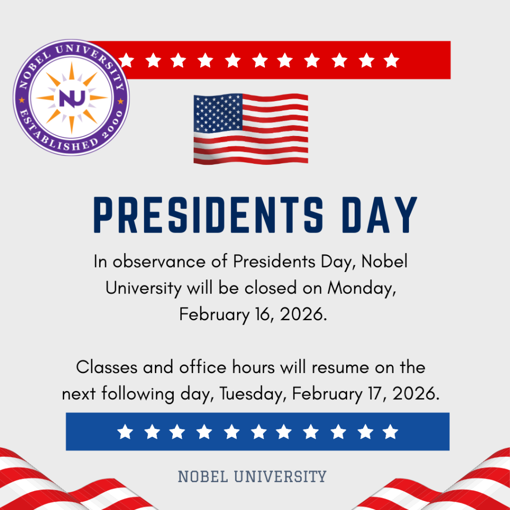 In observance of Presidents Day, Nobel University will be closed on Monday, February 16, 2026. Classes and office hours will resume on the next following day, Tuesday, February 17, 2026. We hope you all have a great weekend.